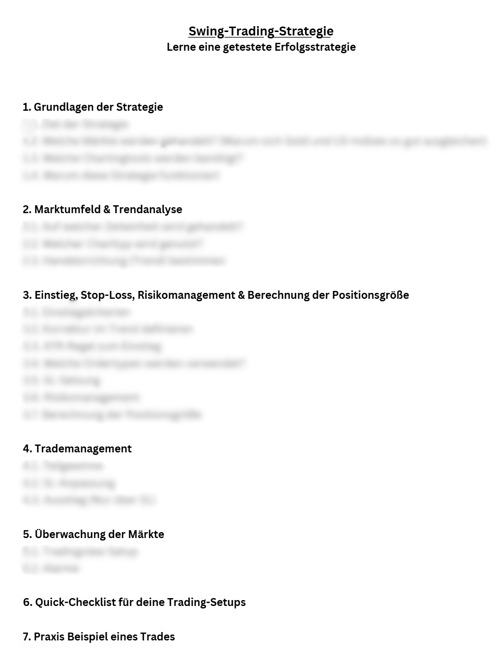 Die Strategie besteht aus einem vollständigen, regelbasierten System: klare Einstiegslogik, definierte Ausstiegsregeln, strukturiertes Trade-Management, Positionsgrößen-Berechnung und Checklisten für deinen gesamten Trading-Ablauf. Du lernst Schritt für Schritt, wie du Trades planst, eingehst und professionell verwaltest.
